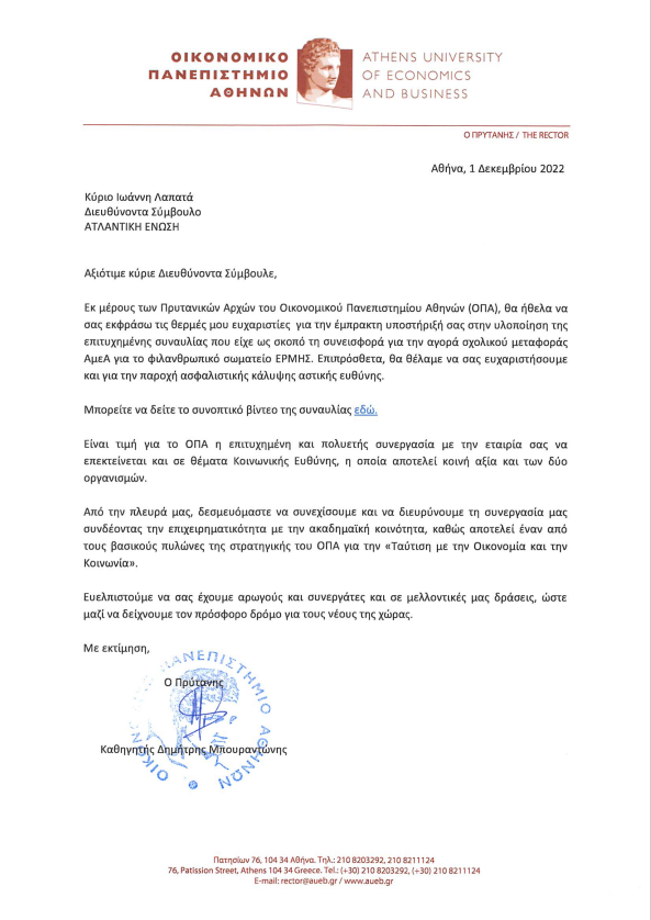 Ακολουθεί ευχαριστήρια επιστολή του Πρύτανη του Οικονομικού Πανεπιστημίου Αθηνών, Καθ. Δ. Μπουραντώνη